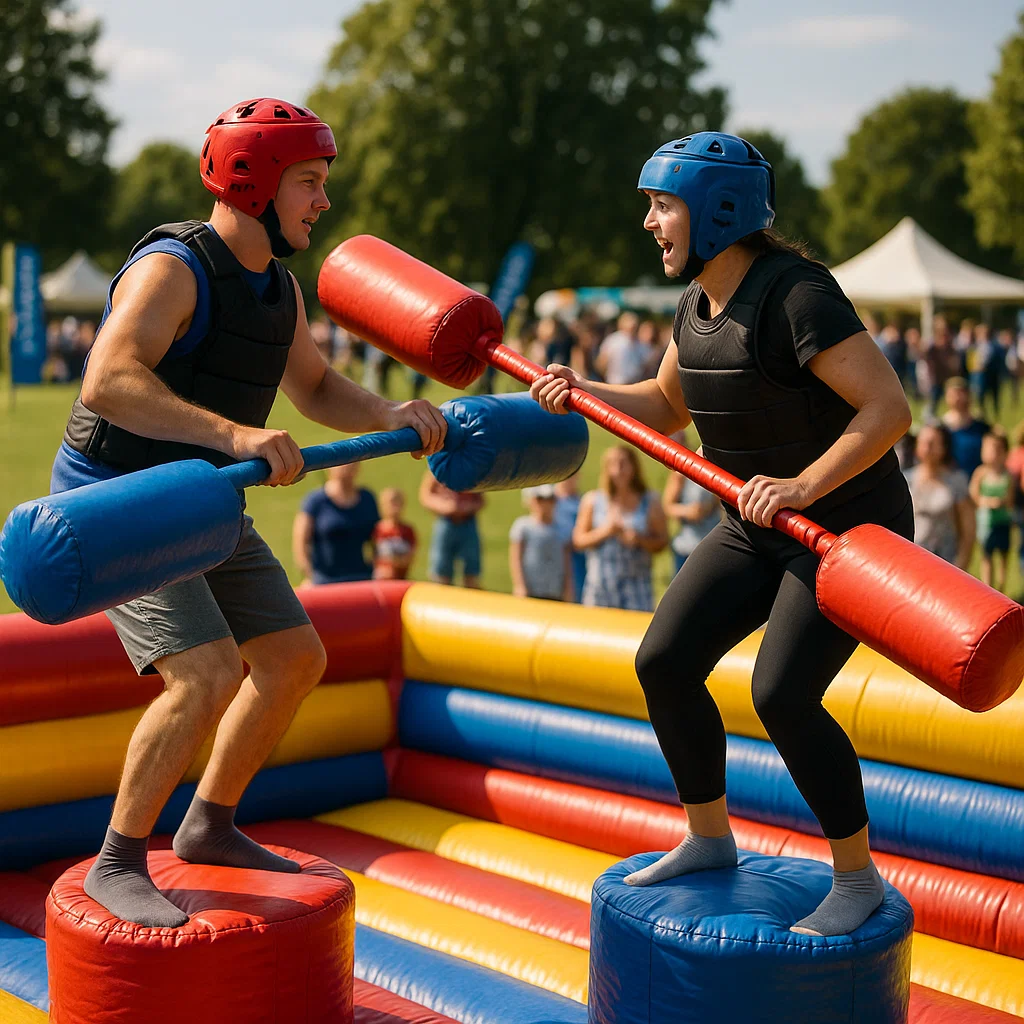 Inflatable gladiator jousting rental showing exciting friendly competition